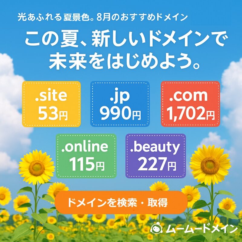 今後もムームードメインでは、季節やトレンドに合わせたお得なドメイン情報やキャンペーンをお届けしてまいります。この夏の熱い思いを、あなたのドメイン名に込めて、新しい物語を始めましょう!