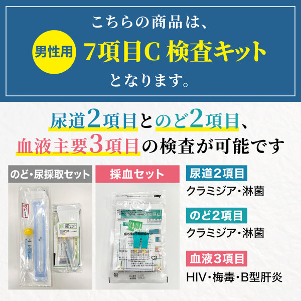 発売日2022-08-16 12:00:00ジャンル性感染症検査 健康診断 検査キット 衛生用品・ヘルスケア ヘルス&ビューティー メーカーメディカル・コア 品番storeghw0014899価格¥13420 7項目性病検査キット[HIV、梅毒、B型肝炎、淋菌、クラミジア、咽頭淋菌、咽頭クラミジア] 【迅速即日発送】月曜~金曜12:00までのご注文は当日発送! 【スピード報告】検体到着日から最短2営業日後に結果報告! 【衛生検査所】登録衛生検査所で検査を行いますので安心です。 【スマホで確認】検査結果はスマホで見られて便利! ※クラミジア・咽頭クラミジア・カンジダ・トリコモナス陽性の方は検査結果画面をスクショし、そのままDMMオンラインクリニックの性感染症診療へお進み頂けます ※その他の症状陽性の方は全国提携医療機関にて受診頂きますようお願い致します。(検査結果画面より提携医療機関の確認が出来ます) ※発送はクロネコヤマトコンパクトにて送付します。コンビニ・ヤマト直営店受け取りご希望の方は、クロネコメンバーズ登録後に配送先変更でコンビニ・ヤマト営業所をご指定下さい ご注意(免責)> 必ずお読み下さい ■検査に関するご注意 1.この検査は各疾患の早期発見の補助として用いるものです。 本サービスで行われる検査は一次検査(スクリーニング)であり、検査結果は病名を診断するものではありません。陽性の結果が出た方や自覚症状のある方は、医療機関での受診をお勧めいたします。また、治癒確認は、必ず受診された医療機関で行なってください。 2.妊娠中の方や、何らかの疾患で受診中の方は、医療機関にてご相談ください。 3.ご使用に際しては取扱説明書をよくお読みください。 ■商品パッケージについて パッケージ変更の為、画像と異なったパッケージの商品をお届けする場合がございます。 商品の仕様変更等はございませんので、予めご了承ください。 医薬品販売業許可 許可番号:第5304220579号 法人名称:合同会社DMM.com 店舗の名称:合同会社DMM.com 新宿営業所 店舗の所在地又は営業区域:東京都新宿区西新宿7-20-1 住友不動産西新宿ビル 有効期間:令和4年8月15日から令和10年8月14日まで 取扱品目:全ての医療用医薬品、要指導医薬品及び一般用医薬品 ご注文後のキャンセルは原則、承っておりません。 事前に十分にご検討いただいた上でご注文ください。 DMMで見る Related posts:性感染症検査 男性用 5項目B 検査キット性感染症検査 女性用 10項目 検査キット性感染症検査 男性用 2項目A 検査キット 投稿ナビゲーション 性感染症検査 女性用 6項目A 検査キット 性感染症検査 男性用 4項目B 検査キット